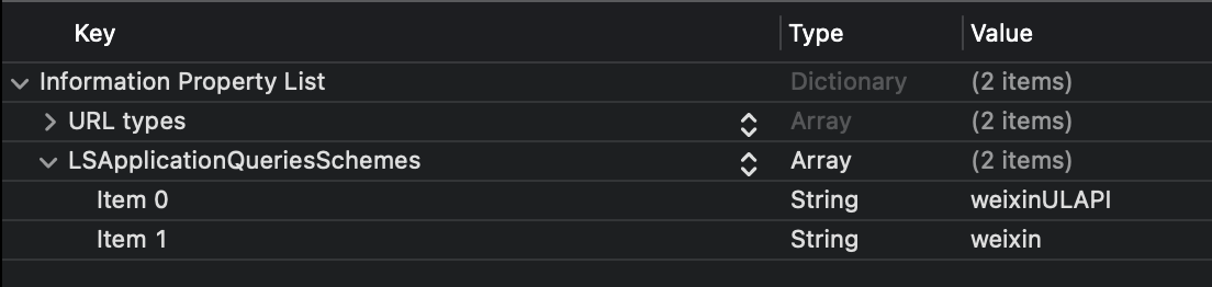 Enfin, ouvrez votre Info.plist, ajoutez weixinULAPI et weixin sous LSApplicationQueriesSchemes.